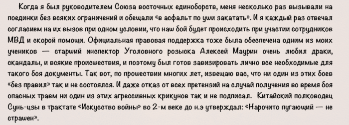 Что это такое, вероятно спросите вы, и какое отношение эти вялые пассы имеют к боевым искусствам? Думается правильным ответом был бы один точный удар в челюсть от человека, пару месяцев прозанимавшегося в самой захудалой районной секции бокса.